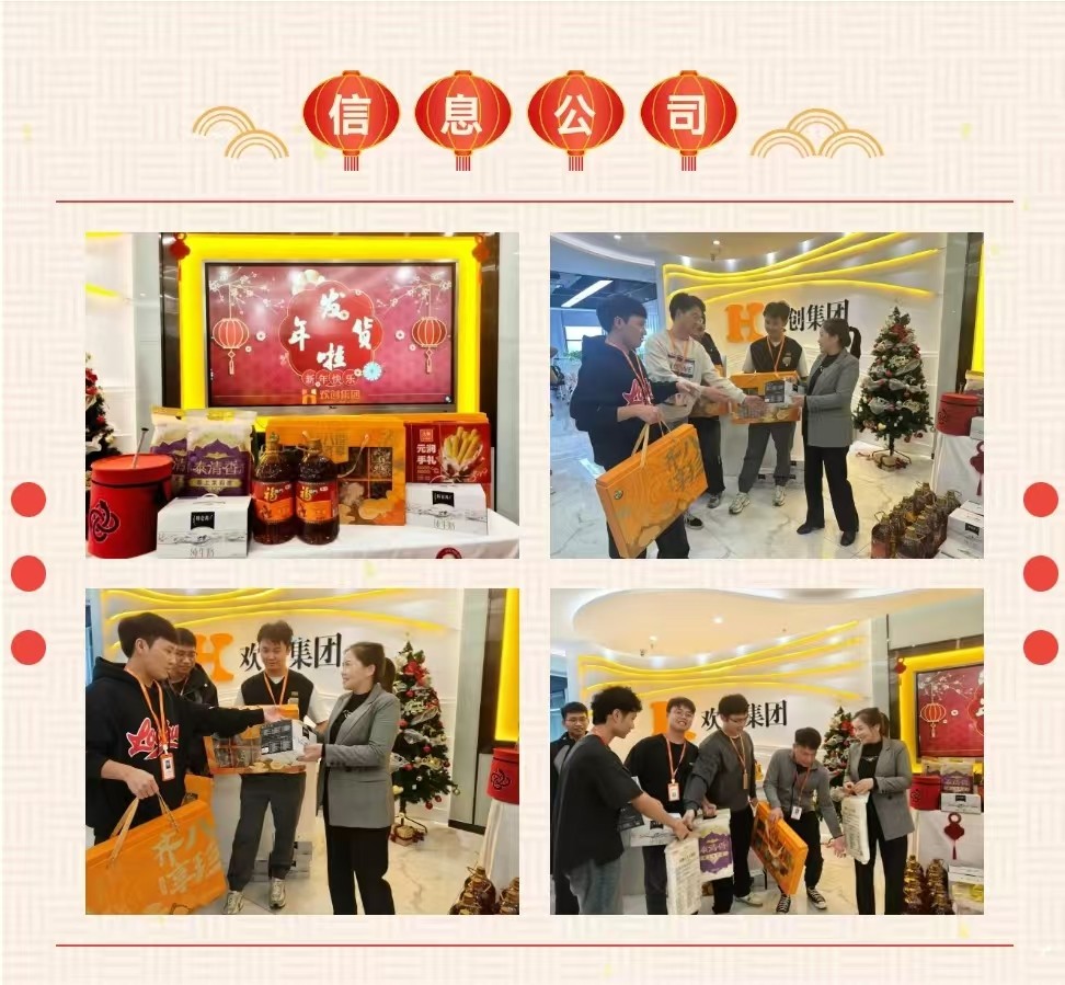 春节将至,为答谢集团及各分子公司的家人们在过去一年的辛勤付出,与公司同舟共济、携手同行,欢创集团特意准备了一批精美而实用的年货礼盒。这些礼盒由董事长罗宁弟亲自在总部派发,并将从总部发往全国各分子公司,向每一位欢创家人送上诚挚的问候和新年的祝福。年味浓浓,情谊融融。在新春年货发放现场,年货堆积如山,映入眼帘的是家人们幸福喜悦的笑容——
